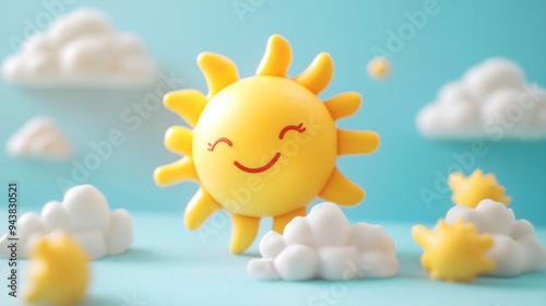 Adorable 3D Render of a Smiling Sun Under Bright Sunlight, Depicting Sunstroke and Overheating Concept with Cloudy Sky in a Minimalistic Style, Perfect for Posters, Backgrounds, and Banners
