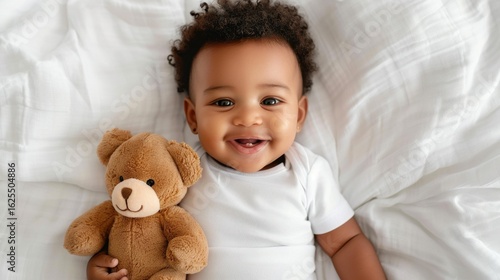 Adorable African American baby smiles with a fluffy teddy bear on a cozy white bed, captured in a heartwarming top view.