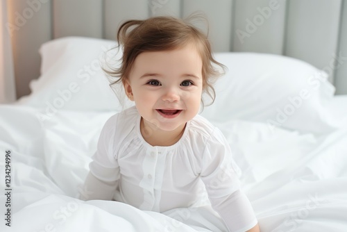 Adorable baby girl wearing white pajamas, enjoying playtime on a comfortable bed with fresh white linens