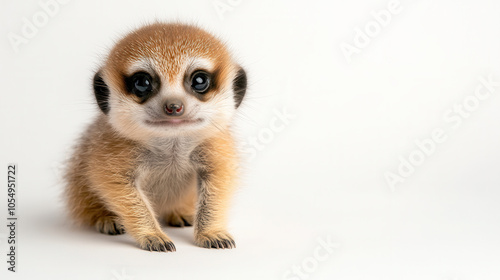 Adorable baby meerkat with big eyes and soft fur, standing alert and curious. This charming creature captures attention with its playful demeanor and unique features