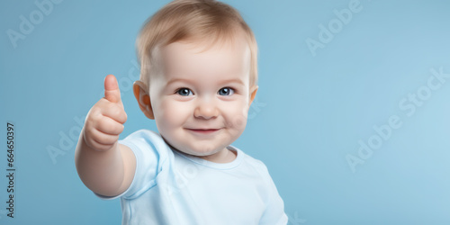 Adorable baby toddler showing thumb up. Pale blue background with copy space