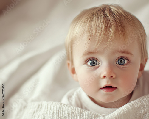 Adorable Baby with Big Blue Eyes on Soft Blanket, Close-up Portrait Photograph Capturing Infant Innocence and Curiosity, Perfect for Family and Parenting Themes.