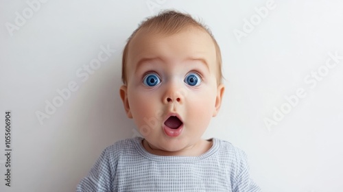 Adorable baby with surprised expression, big blue eyes, and round cheeks, looking curious, isolated on white