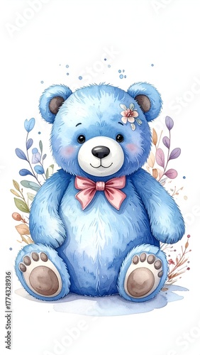 teddy, bear, blue, cute, children, decor, plush, toy, leaf, floral, cuddly, happy, soft, smiling, children, gift, art, illustration, nature, pastel, character, design, adorable, vibrant, joy, play, whimsical, creative, sweet, charming, delightful, friendly, innocence, fun, cosy, warmth, imagination, childhood, playful, love