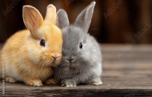 Adorable bunny duo cuddling close together is perfect for easter promotions, spring ads, children's books, and pet store flyers, celebrating friendship