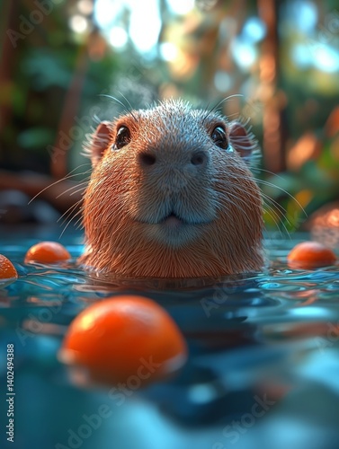 capybara, water, mammal, rodent, cute, adorable, nature, tropical, forest, jungle, happy, serene, calm, peaceful, relaxing, joyful, content, orange, fruit, floating, closeup, portrait, wet, furry, vibrant, bright, sunlit, summer, daytime, digital, art, render, illustration, realistic, image, photograph, photo, graphic, ai, animal, wildlife