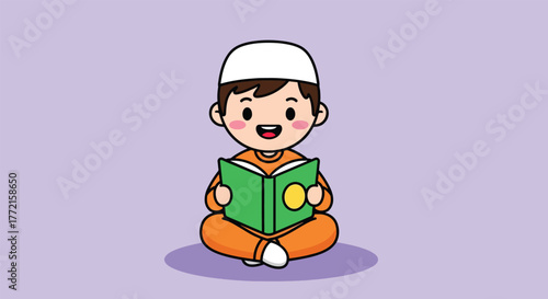 boy, children, children, young, male, cartoon, illustration, drawing, character, cute, adorable, happy, smiling, reading, book, story, learning, education, cognition, wisdom, study, school, religious, islamic, muslim, cap, hat, traditional, clothing, orange, green, sitting, cross-legged, seated, cross, leg, posture, pose, ramadan, eid, design, graphic, art, digital, vector, icon, symbol
