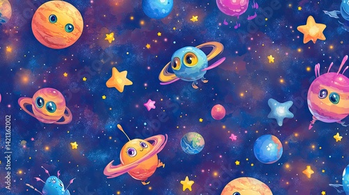planet, star, space, galaxy, cosmos, cartoon, cute, whimsical, childish, cosmic, astronomy, celestial, illustration, artwork, fantasy, colourful, vibrant, bright, happy, joyful, fun, children, children, toddler, baby, infant, pattern, design, background, texture, outer, universe, night, sky, dream, imagination, wonder, magical, artistic, creative