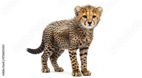 Adorable cheetah cub stands alert against bright white background. AI Generated