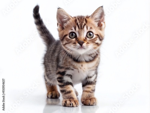 Adorable curious European Shorthair kitten walks sideways, gazing straight at the camera with bright eyes, isolated on a clean white background.