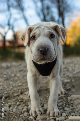 Adorable cute puppy portrait, standing on river rocks, with warm colored autumn sunset light and blurred background