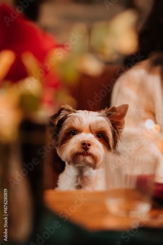 dog, puppy, pet, adorable, cute, small, fluffy, dinner, eatery, table, celebration, party, event, indoor, cosy, festive, warm, evening, light, bokeh, animal, home, dining, holiday, gathering, purebred, portrait, sharpened, curious, watching, alert, friendly, decor, glasses, wine, epicure, people, wait, plate, seated, lap, floral, companion, loyal, happy, luxury, family, closeup