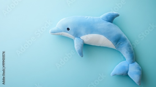 Adorable Dolphin Plush Toy on Plain Sky Blue Background - Overhead View