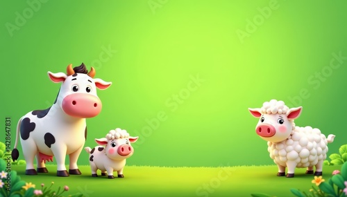 Adorable farm animal print with cartoon characters like cow, pig, sheep on green backdrop, green, background