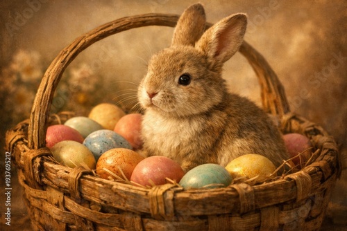 easter bunny, easter egg, spring, rabbit, basket, cute, fluffy, holiday, celebration, traditional, adorable, animal, nature, pastoral, countryside, farm, domestic, pet, small, furry, whisker, ear, eye, nestled, straw, hay, woven, rustic, vintage, antique, decoration, ornament, painted, colourful, many-coloured, pastel, pink, blue, yellow, orange, brown, background, soft, warm, light, joyful, festive, greeting, newborn