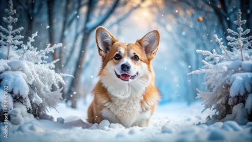 Adorable fluffy corgi wags tail, paws covered in snow, as it explores winter wonderland, surrounded by frosty trees and soft snowflakes gently falling.