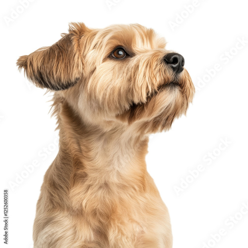 dog, puppy, canino, pet, animal, fluffy, furry, cute, adorable, brown, beige, gold, hair, ear, eye, looking up, head, portrait, isolated, white background, studio shot, small dog, mixed breed, loyal, friendly, playful, happy, sweet, charming, watchful, attentive, curious, expression, emotion, animal portrait, head shot, closeup, detail, texture