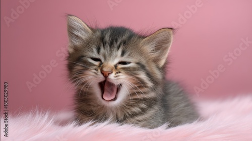 Adorable fluffy kitten yawning with playful expression against soft pink background, capturing the essence of joy and cuteness in pet photography