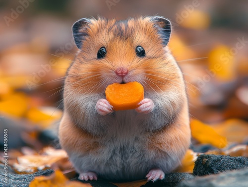 Adorable Golden Hamster Munching on a Treat Amidst Autumn Leaves, Displaying Pure Delight and Charm with Its Tiny Paws and Expressive Eyes