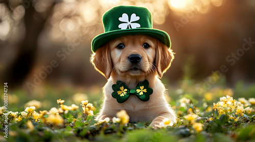 golden retriever, puppy, dog, hat, bow tie, green, clover, flower, yellow, field, spring, cute, adorable, pet, animal, nature, sunlight, sunshine, outdoors, photo, image, picture, canino, mammal, portrait, happy, playful, festive, celebration, holiday, irish, luck, shamrock, grassy, meadow, background, pretty, charming, sweet, innocent, young, small, fur, gold, coat, paw, ear, eye