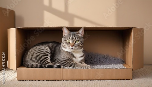 Adorable Grey Tabby Cat Relaxing Inside a Cardboard Box at Home