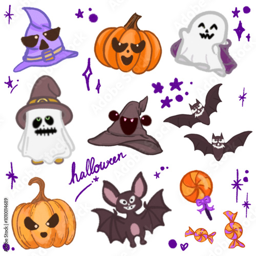 halloween, cute, cartoon, bat, ghost, pumpkin, candy, illustration, skittish, fun, playful, festive, trick or treat, party, invitation, decoration, greeting card, sticker, banner, celebration, october, costume, autumn, magic, fantasy, horror, night, scarey, black, orange, purple, adorable, background, graphic design, digital artwork, creepy, spider's web, spider, haunted, seasonal, holiday