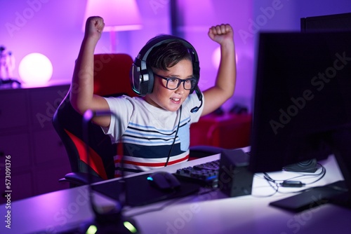 Adorable hispanic boy streamer playing video game with winner expression at gaming room