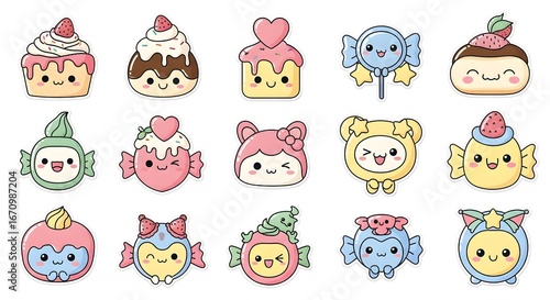 sticker, sheet, cartoon, character, cute, pastel, adorable, playful, happy, illustration, design, vector, clip art, art, drawing, graphic, icon, element, decoration, scrapbook, journal, planner, fun, sweet, lovely, cheerful, joyful, smiling, winking, heart, star, flower, animal, food, sweet, dessert, candy, lollipop, cupcake, donut, ice cream, rainbow, magical, fantasy, whimsical, childlike