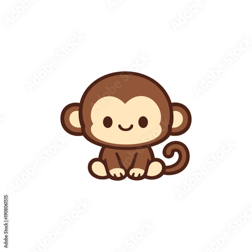 Adorable kawaii-style monkey character sitting with a sweet smile and simple rounded shapes. Minimal cartoon illustration in warm brown tones, isolated on a light background Perfect for nursery design