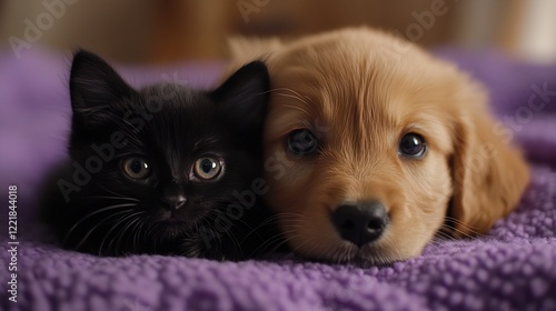 puppy, kitten, dog, cat, golden retriever, black cat, animal, pet, friendship, companionship, adorable, cute, fluffy, furry, cuddly, sweet, innocent, playful, lovely, charming, heartwarming, tender, gentle, loving, bond, connection, close, together, best friend, happy, relaxed, peaceful, cosy, comfortable, resting, sleeping, nap, blanket, purple, soft, young, small, paw, whisker, eye, nose, head, face, tail