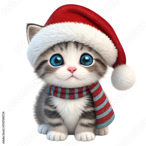 Adorable kitten wearing Santa hat and scarf, a festive touch for your holiday projects and heartwarming seasonal designs