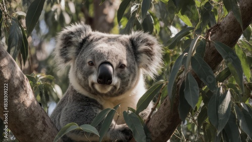 Adorable Koala Bear Resting Peacefully in Eucalyptus Tree.