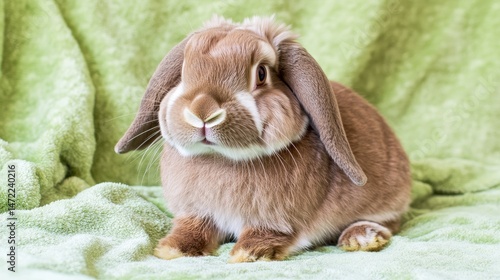rabbit, pet, animal, mammal, cute, fluffy, light brown, beige, green, fabric, soft, closeup, domestic, adorable, studio, isolated, vertebrate, animal portrait, small animal, friendly, calm, peaceful, companion, closeup, portrait, domesticated, image, photo, copy space, soft focus, background, light, indoor, day