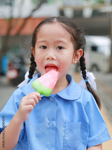 Adorable little Asian child girl in school uniform eating ice-cream in the park.