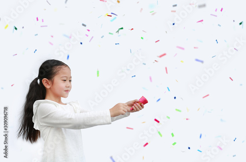 Adorable little Asian child girl shooting party popper confetti over white background with copy space.