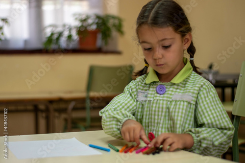 Adorable niña en su primer día de colegio vestida con mandilón a cuadros verdes dibujando y mirando libros.
