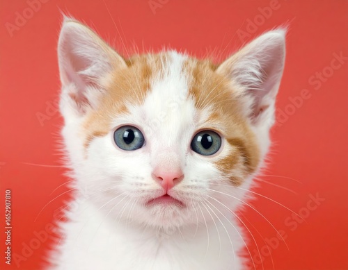 kitten, orange, white, blue, eye, cat, felino, cute, pet, animal, furry, whisker, ear, portrait, domestic, playful, young, indoor, curious, sweet, small, fluffy, red, background, bright, charming, innocent, alert, soft, adorable