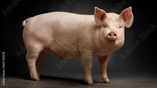Adorable pig portrait standing in the studio looking at the camera with a cute pink nose and floppy ears