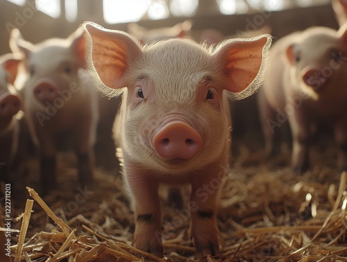Adorable Piglets in Barn Setting Captivatingly Gaze at Camera, Showcasing Their Playful Nature and Innocent Charm Amidst Straw Environment