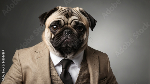 Adorable Pug Dog dressed like a businessman, suit costume outfit professional portrait