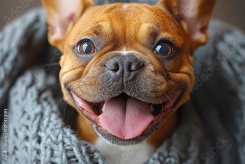 puppy, dog, smile, adorable, blanket, cosy, happy, cute, expression, pet, animal, brown, fur, relaxed, warmth, indoor, portrait, playful, cheer, joy, cuddled, sleepy, companion, closeup, gaze, friendliness, tongue, ear, wrinkled, joyful, face, texture, comfort, affectionate, love, friendship, cheerful, canino, mood, nestled, calmness, relaxation, furry, lovable, joyfulness