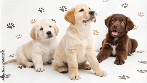 Adorable Puppies on White Background with Paw Prints - Long Exposure Photography of Three Cute Dogs, Perfect for Pet Lovers, Animal Photography, and Cute Dog Images