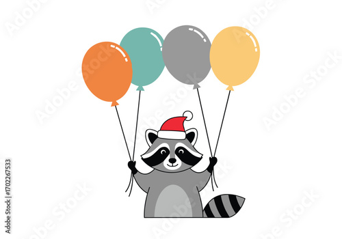 Adorable raccoon wearing santa hat holding colorful balloons for festive celebration