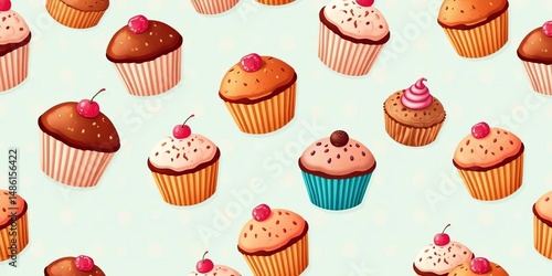 cute, cardboard box, digital artwork, bright, muffin, dessert, design, charming, sweet, food, tileable, tasty, repeat, graphic, delicious, wallpaper, colourful, pastry, vector, print, seamless, confectionery, bakery, adorable, background, pattern, baked goods, whimsical, element, illustration, cupcake, texture