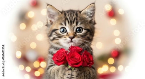 kitten, cat, tabby, animal, pet, cute, adorable, young, felino, domestic, mammal, portrait, head shot, face, eye, blue, stripes, rose, red, flower, collar, decoration, festive, bokeh, light, blurred, background, studio, shot, isolated