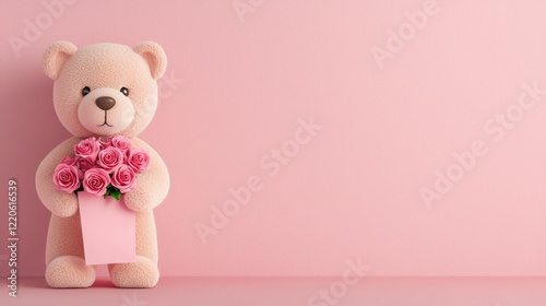 Adorable Teddy Bear Holding Bouquet of Pink Roses Against a Soft Pink Background for Heartwarming Moments