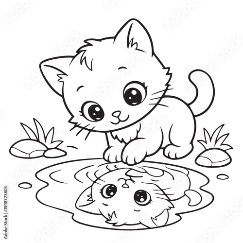 Adorable vector of a small kitten gazing at its reflection in a water puddle, clean outlines and simple shapes, perfect for children coloring activity.