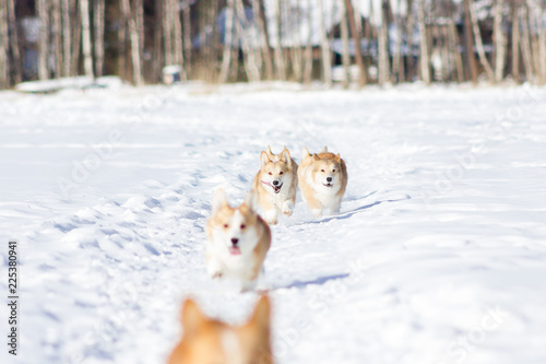 Adorable welsh corgi pembrokes walks outdoor at winter