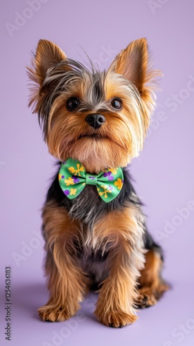 yorkshire terrier, puppy, dog, bow tie, pet, animal, studio shot, purple background, cute, adorable, small dog, hairy, long hair, sitting, closeup, canino, yorkshire, terrier, fashion, sweet, friendly, happy, playful, portrait