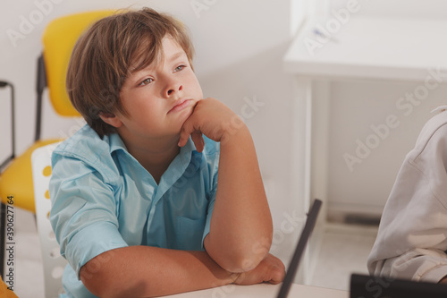 Adorable young boy looking away thoughtfully, sitting in classroom, copy space